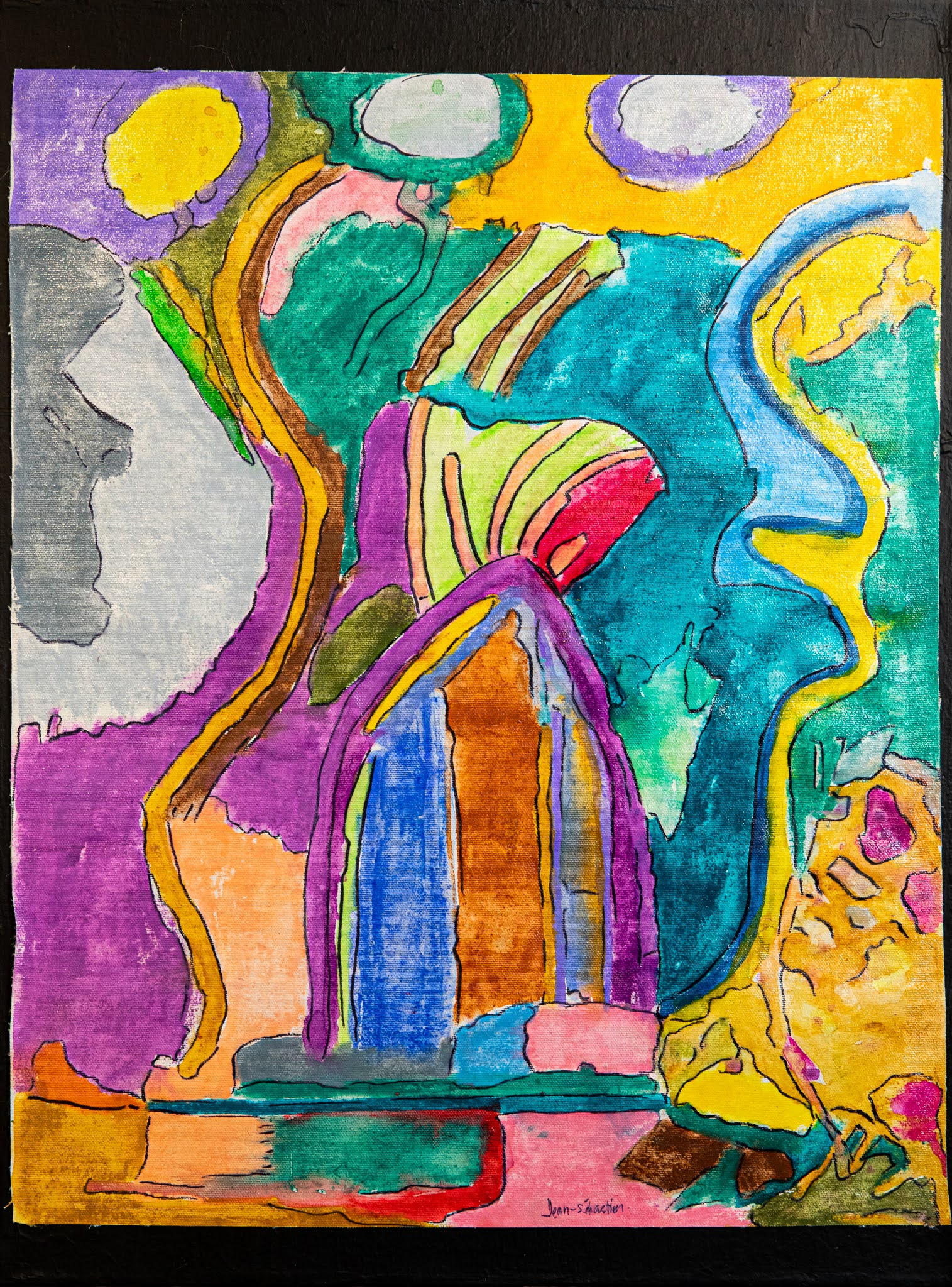 Je m´appelle Jean-Sébastien Saucier-Carra Je vis avec ma mère, Ronald son amoureux et Mélissa. Je travaille à la Gang à Rambrou. Je fais du dessin, de la peinture et de la musique. Voilà! J´aime jouer la batterie. Mes musiciens préférés sont Fred et Jean-François (mes professeurs) le vendredi. J´aime aussi le groupe Kiss. À la maison, je fais moi-même le ménage. Je suis autonome. J´aime aider les autres. J´aime porter des beaux vêtements. J´aime dessiner ce qui m´entoure, j´observe tout. J´aime faire des grands traits et des taches de couleurs…avec des crayons de cire, de bois et de la peinture à l´aquarelle. J´aime travailler en peinture…sur papier, sur une toile…pour une exposition…pour le montrer.