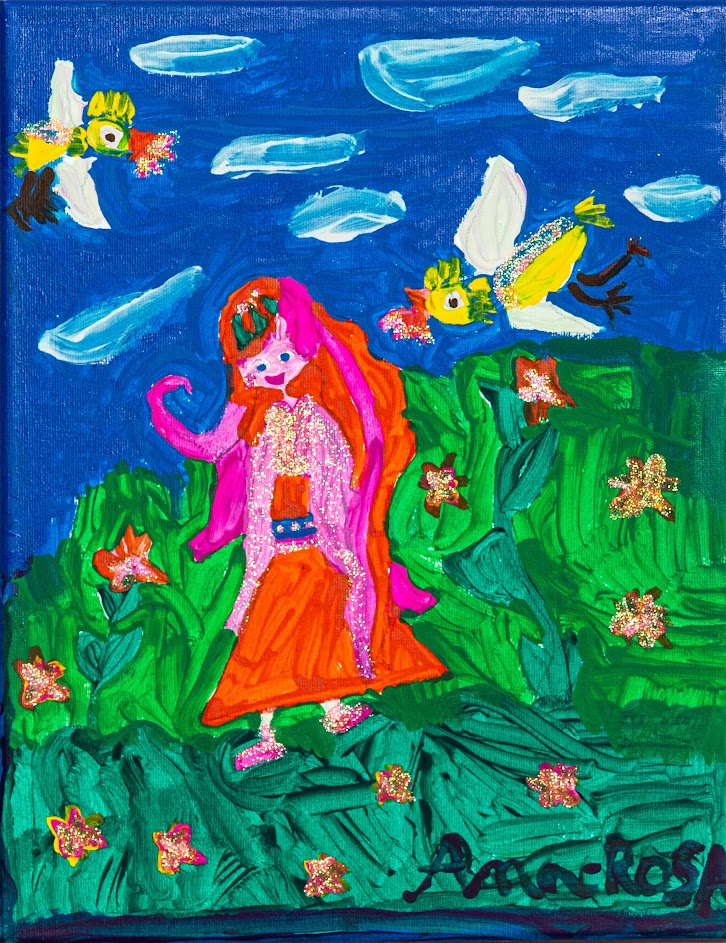 Elle s’appelle Ana-Rosa Pires. Elle est née au Portugal et s’est installée avec sa famille à Montréal à l’âge de trois ans. Elle a commencé à dessiner et à peindre avec ses doigts à l’école primaire. « À la maison, je dessinais beaucoup chez moi seule dans ma chambre. Et quand je gardais des enfants, je faisais de l’art avec eux. Ils avaient du fun avec moi» explique-t-elle. Dans la vingtaine, Ana-Rosa a suivi des cours de peinture au Celo (Centre Communautaire de Loisirs de la Côte-Des-Neiges). Ce qui l’inspire, c’est le monde des fées. « C’est un univers amusant pour moi. » Elle aime beaucoup peindre des personnages imaginaires et féériques. La peinture, explique-t-elle : « ça me relaxe, ça me fait travailler la tête et ça m’emmène dans un autre monde. J’aime ce que je fais, je suis fière de moi! » Il s'agit d'une fée prénommée Anastasia. Elle se trouve dans un décor bucolique, entourée d'oiseaux et de fleurs.