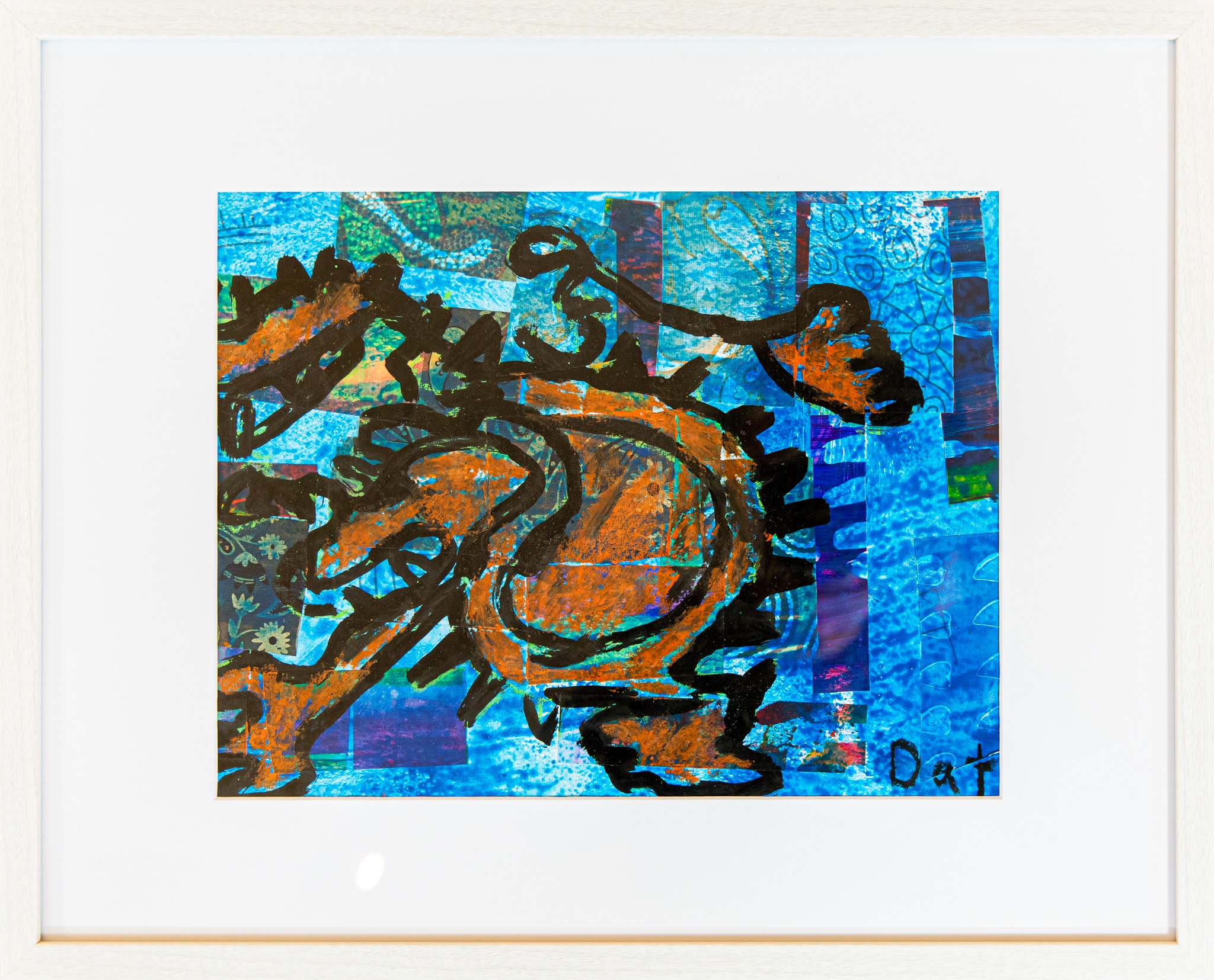 Pour réaliser cette œuvre, j’ai fait un collage avec des feuilles de textures différentes, ensuite, j’ai tout couvert avec de la peinture acrylique bleue. J’ai fait une recherche sur internet pour voir des images de dragons et je les ai dessinés avec de